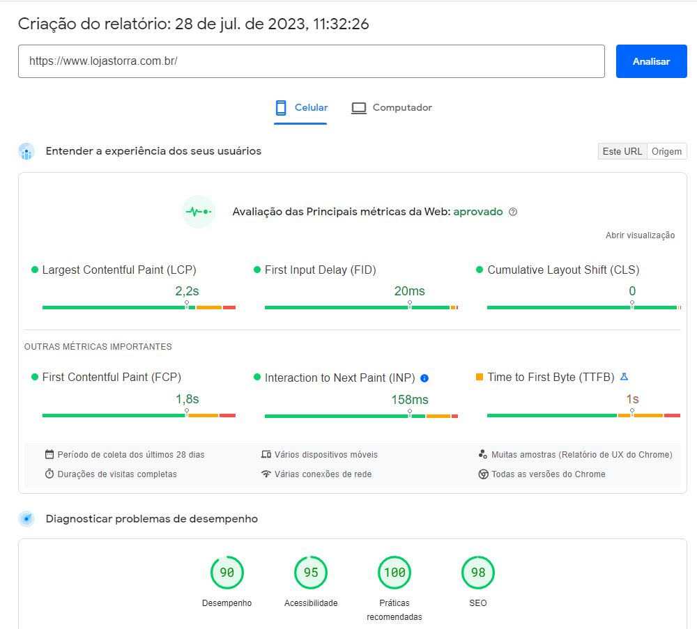 Com efeito, esta loja está agora dentro do alto padrão de desempenho do Google PageSpeed. Ela certamente não terá problemas de carregamento na Black Friday 2023. Ademais, ela conta com notas 90, 95, 100 e 98 em desempenho, acessibilidade, boas práticas e SEO, todas dentro do recomendado pelo Google.